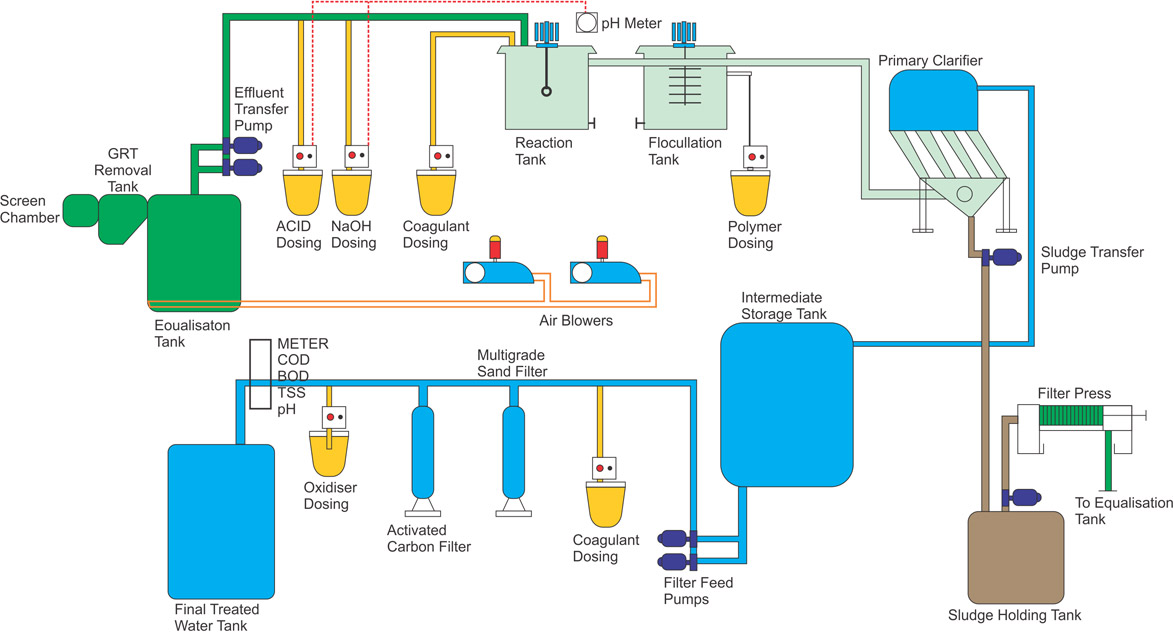 - Equalization– Instead of storage of effluent to uniform the parameters, we utilize this unit by partial reduction of organics and proper cooling with perfect aeration through diffuses.
